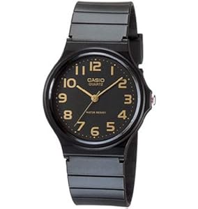 The basic black-and-gold design of the Casio Men's Analog Watch makes it a simple, versatile timepiece great for everyday wear. The watch is constructed with a resin case, a black stationary resin bezel, and a black resin link bracelet with an adjustable buckle clasp. A durable mineral window protects the black dial face, which cleanly features gold-tone Arabic numeral hour indexes, gold-tone minute markers, and complementary watch hands.